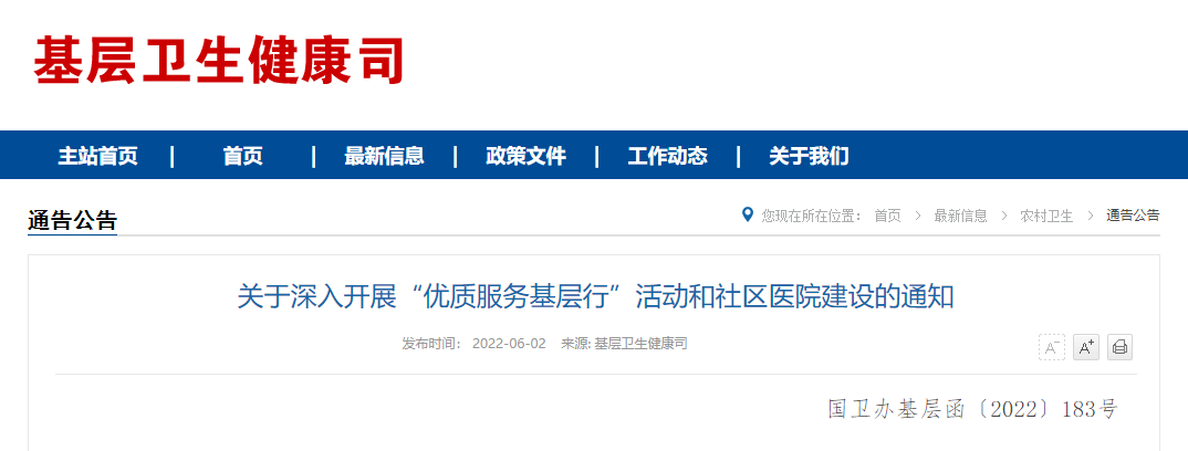 6月2日,國家衛健委基層衛生健康司發布《關于深入開展“優質服務基層行”活動和社區醫院建設的通知》